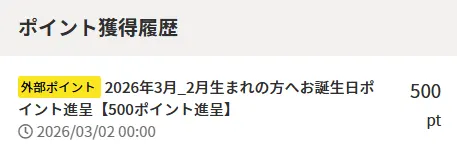 (2)マイページへ遷移後、下部へスクロールしますと「ポイント獲得履歴」の記載がございます